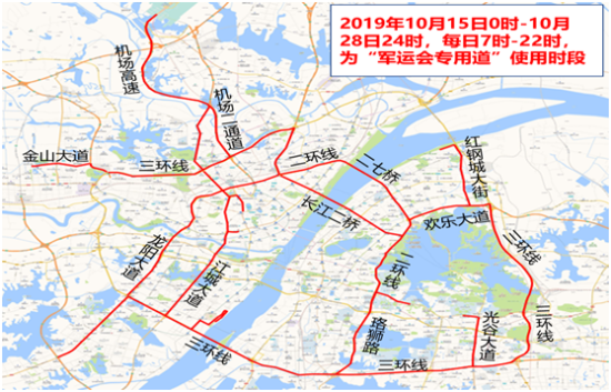“軍運會”交通管理措施自2019年10月15日0時起實施,至2019年10月28日24時止。