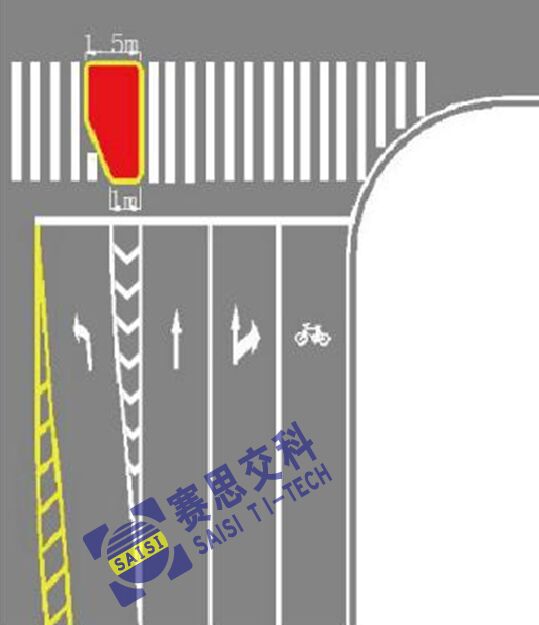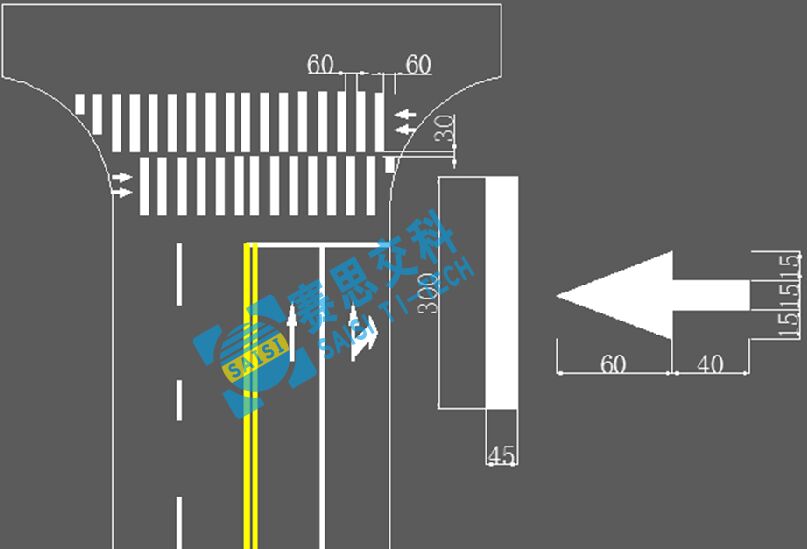 為提高人行橫道的通行秩序與效率,在具備可施劃6m寬度人行橫道線的條件下,可采用導(dǎo)向式人行橫道線施劃方式,線寬為45cm,兩段線長都為3m,兩段線間隔30cm,實空對稱交錯施劃,在人行橫道線的兩端按照靠右通行的習(xí)慣添加導(dǎo)向箭頭,具體尺寸如下圖所示。