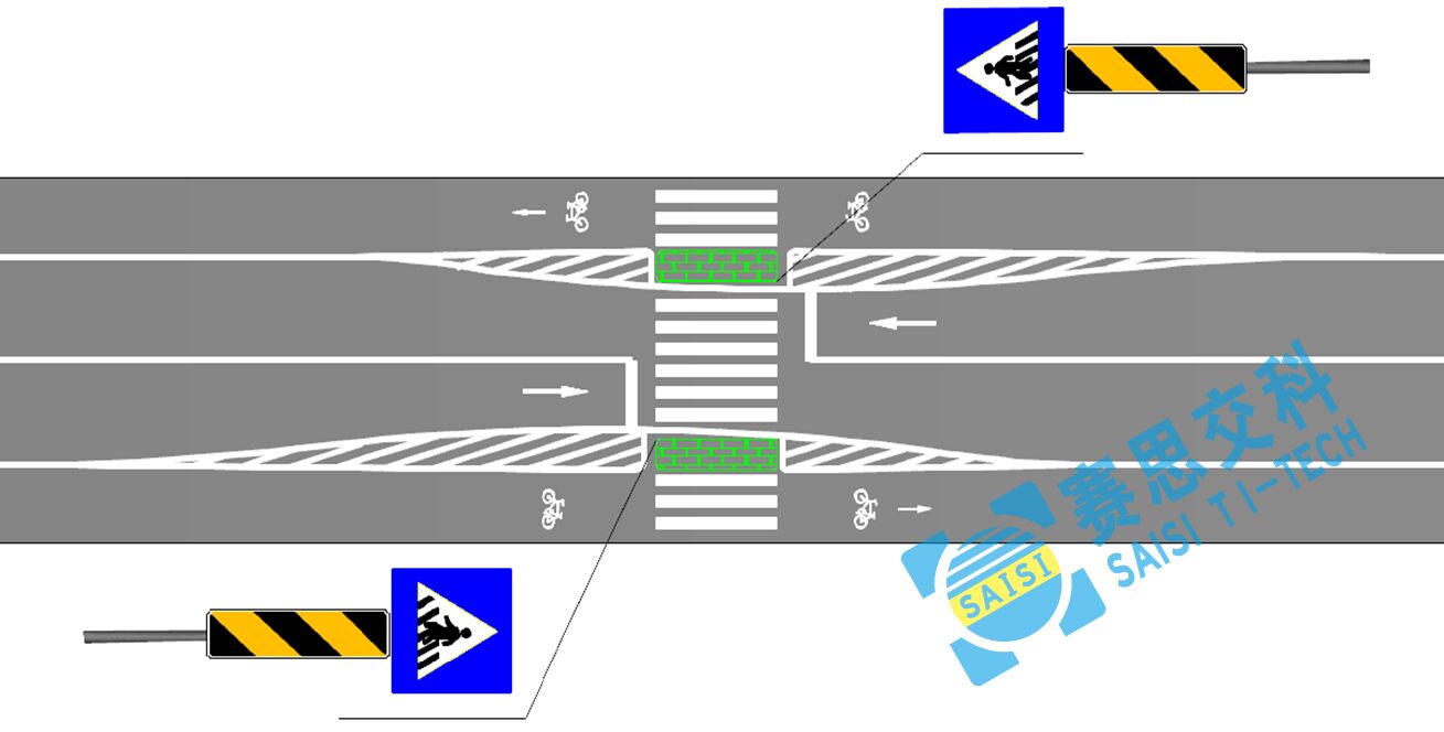 通過增設(shè)實體安全島及上游車道寬度進(jìn)行壓縮,強制車輛減速行駛,提高行人過街的安全性。兩端設(shè)置人行橫道指示標(biāo)志,建議采用主動發(fā)光工藝,提升標(biāo)志的遠(yuǎn)距離視認(rèn)性,和動態(tài)警示性。
