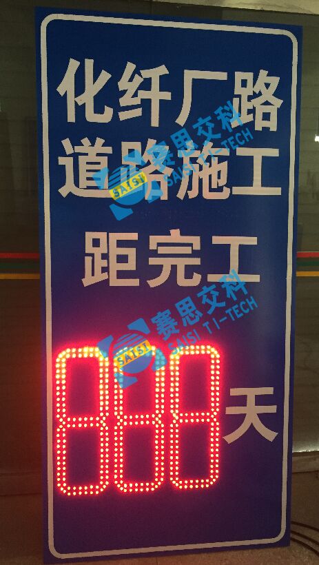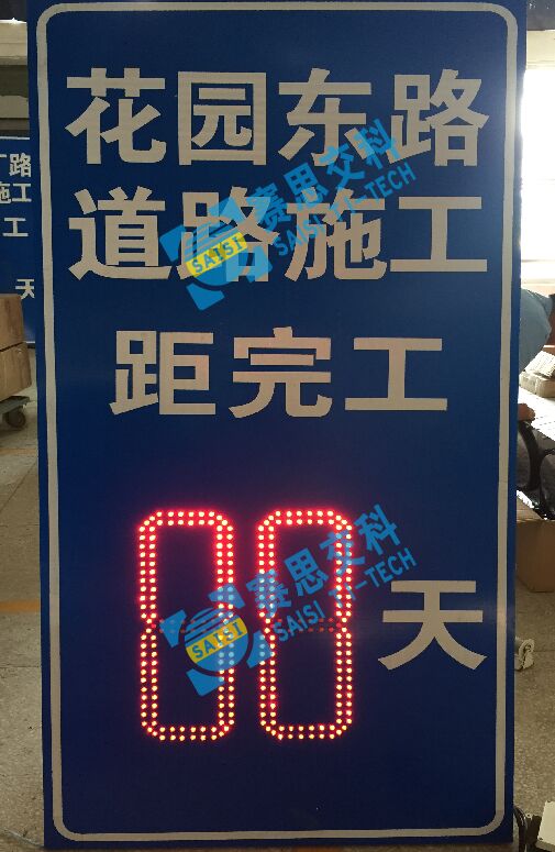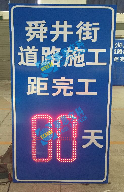 1、工藝說明:在標(biāo)志版面中嵌入“8”字型LED發(fā)光條碼,可根據(jù)需要設(shè)置組數(shù)(個位、十位、百位),自動校正時間節(jié)點,動態(tài)發(fā)光顯示剩余天數(shù),有效告知施工區(qū)作業(yè)時間。