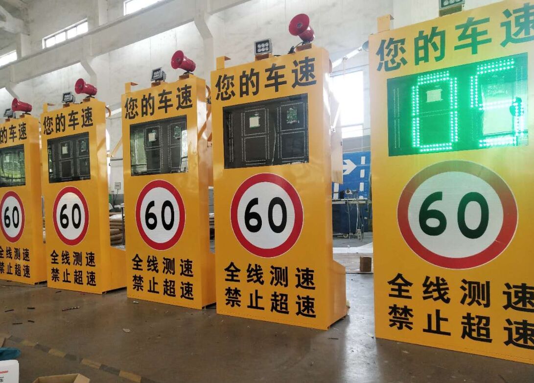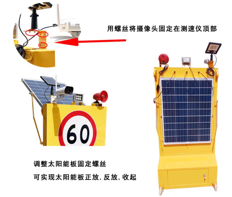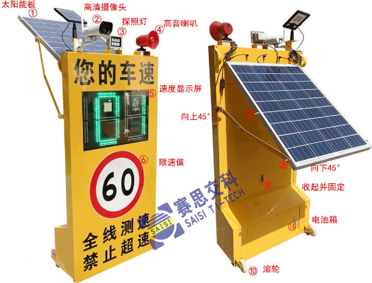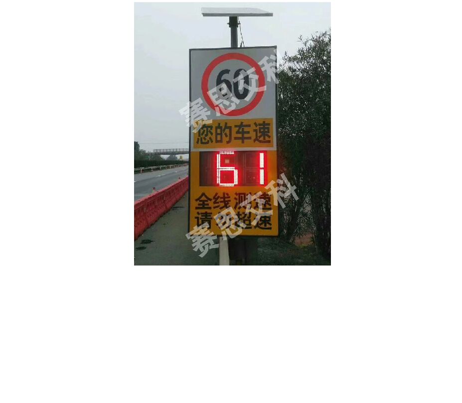 1、標(biāo)志整體為立體裝置平臺(tái),主要包括:語音警示喇叭、速度條碼顯示屏、視頻記錄攝像頭、太陽能蓄電池供電系統(tǒng)等設(shè)備。當(dāng)被測(cè)車輛通行車速超過限制速度時(shí),速度條碼顯示屏以紅色顯示當(dāng)前車速,并啟動(dòng)語音警示喇叭告知車輛以超速行駛;當(dāng)被測(cè)車輛通行車速超過限制速度時(shí),速度條碼顯示屏以綠色顯示當(dāng)前車速。攝像頭全天候記錄路段動(dòng)態(tài)視頻,夜間開啟補(bǔ)光燈。該裝置對(duì)車輛超速行駛行為有較高的警示效果、特別適用于事故易發(fā)路段、團(tuán)霧頻發(fā)路段、需加強(qiáng)管理路段。