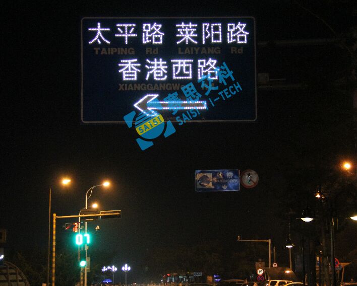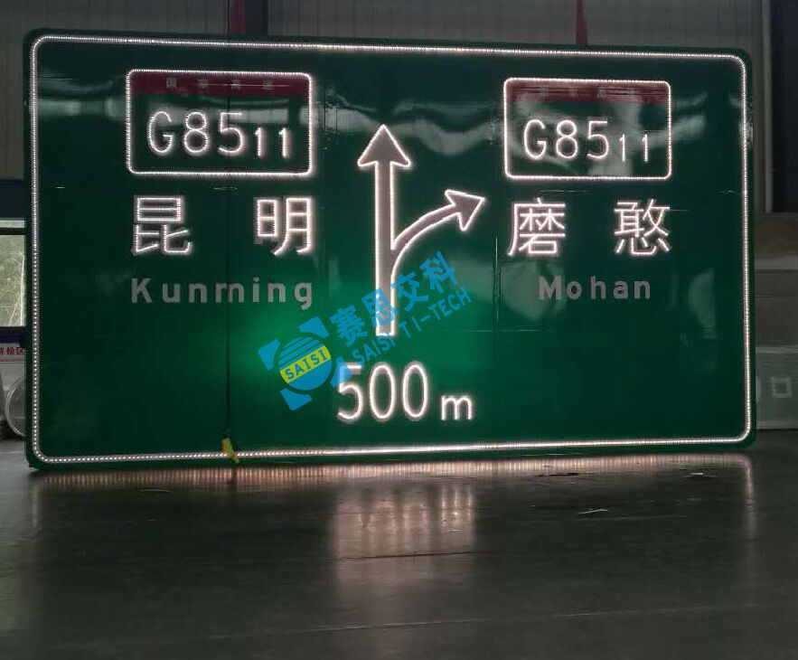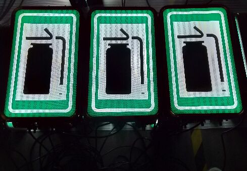 “大型指路類(lèi)點(diǎn)陣型主動(dòng)發(fā)光標(biāo)志”,其標(biāo)志版面中圖案、文字、數(shù)字、字母、邊線(xiàn)等外嵌高亮LED發(fā)光管,并通過(guò)調(diào)光測(cè)試軟件,將LED發(fā)光管合理布點(diǎn),并設(shè)置合理的發(fā)光強(qiáng)度,形成由點(diǎn)光源組成的面光源視認(rèn)效果,實(shí)現(xiàn)標(biāo)志牌能主動(dòng)發(fā)光的功能特性,滿(mǎn)足人眼正常、和諧的視覺(jué)捕捉及視認(rèn)效果。