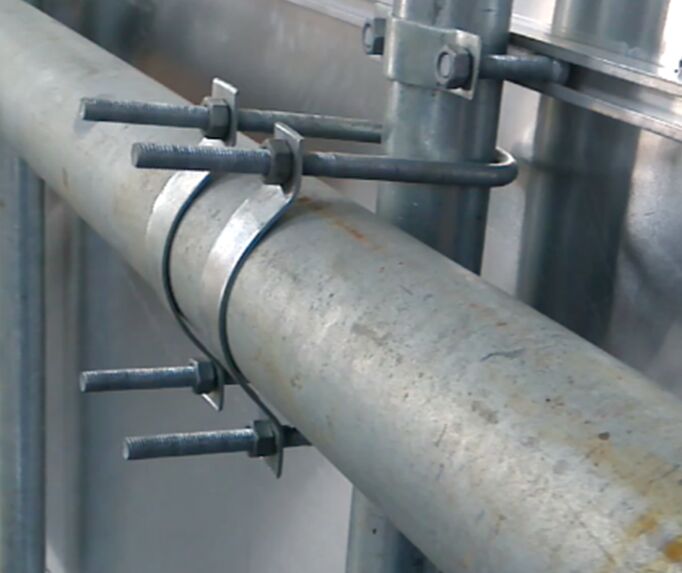 5、將圓管用U型卡箍在懸臂上下對卡,用對應懸臂尺寸的抱箍半片固定于懸臂左右上,用M12螺帽固定。