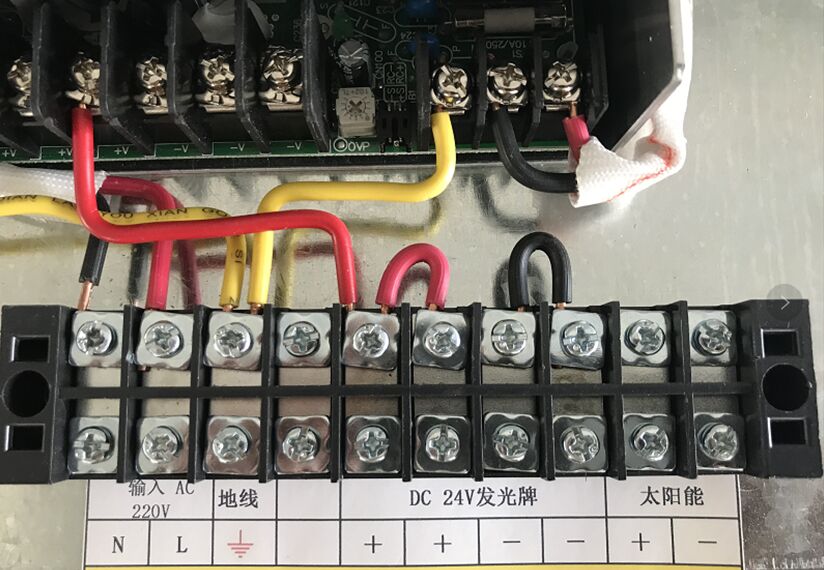 3、半透發(fā)光標志上的電線接入控制箱內(nèi)的低壓DC-24V輸出端子,本次標志正極為棕色線;負極為藍色線。外接電源線接入高壓輸入端子。地線必須接地,導入地面土壤內(nèi)。