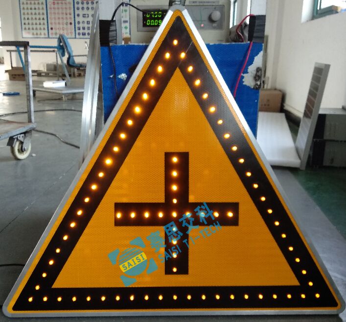 在未設(shè)置信號燈的畸形交叉口,常常由于優(yōu)先通行路權(quán)沒有明確,車輛會(huì)車時(shí),極易發(fā)生碰撞事故,可以通過設(shè)置“?!弊?、“讓”字、“慢”字等公路發(fā)光標(biāo)志牌,和必要的路權(quán)分配指引標(biāo)志(如:“太陽能右下行發(fā)光警示柱”等),明確各方向的優(yōu)先路權(quán),同時(shí)公路發(fā)光標(biāo)志牌具備遠(yuǎn)距離的視認(rèn)性,讓不同方向的交通流能遠(yuǎn)距離發(fā)現(xiàn)前方交叉口的路權(quán)分配信息。