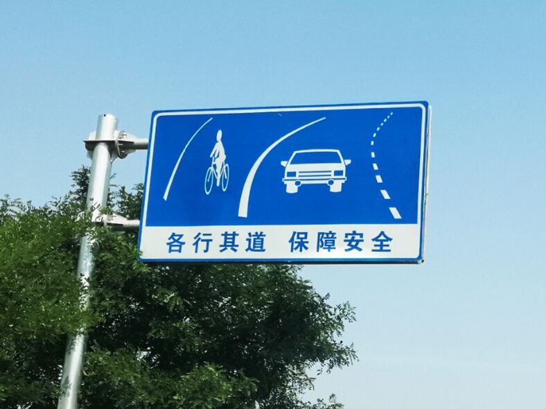 (一)標(biāo)語(yǔ)為:“各行其道、保障安全”。適合于機(jī)、非車(chē)道無(wú)硬性設(shè)施隔離場(chǎng)景。