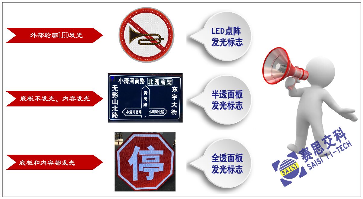 (一)發(fā)光類型選擇。適用于市政工程應(yīng)用的主動(dòng)發(fā)光標(biāo)志,根據(jù)發(fā)光類型劃分,主要有三種:(1)外置LED點(diǎn)陣型主動(dòng)發(fā)光標(biāo)志;(2)半透面板顯示型主動(dòng)發(fā)光標(biāo)志;(3)全透面板顯示型主動(dòng)發(fā)光標(biāo)志。其中外置LED點(diǎn)陣型主動(dòng)發(fā)光標(biāo)志,適合于禁令、警告、指示、指路等各種類型的標(biāo)志,且具備太陽能供電的條件,但版面的發(fā)光視覺,較其它兩種發(fā)光標(biāo)志,在內(nèi)容的成像清晰度上略低一點(diǎn);其中半透面板顯示型主動(dòng)發(fā)光標(biāo)志,僅適用于小型、大型的指示標(biāo)志、指路標(biāo)志、旅游標(biāo)志等深色底膜、白色字符膜的標(biāo)志類型,因深色系反光膜的透光性能差,特別是黑色反光膜,幾乎不透光;其中全透面板顯示型主動(dòng)發(fā)光標(biāo)志,僅適用于小型的禁令標(biāo)志、指示標(biāo)志、指路標(biāo)志版面,不適合大型的標(biāo)志版面,因其面板層為柔性透光結(jié)構(gòu)。所以,需要根據(jù)版面的具體內(nèi)容,選擇合適的發(fā)光類型。