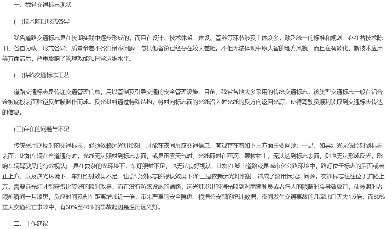 傳統(tǒng)的逆反射交通標(biāo)志,在特殊的交通環(huán)境種,存在功能的局限性?!度嗣窠煌ňW(wǎng)》于2022年1月12日發(fā)文《關(guān)于編制統(tǒng)一的交通標(biāo)志設(shè)置規(guī)范 推廣應(yīng)用主動發(fā)光交通標(biāo)志》中提到:“傳統(tǒng)采用逆反射的交通標(biāo)志,必須依賴遠(yuǎn)光燈照射,才能在夜間反應(yīng)交通信息,客觀存在著如下三方面主要問題:一是,如果燈光無法照射到標(biāo)志表面,比如車輛在彎道通行時,光線無法照射到標(biāo)志表面,或是雨霧天氣時,光線照射在雨滴、顆粒物上,無法達(dá)到標(biāo)志表面,則也無法形成反光,影響車輛駕駛員的有效視認(rèn);二是在復(fù)雜的光環(huán)境下,車燈照射不足,也無法良好視認(rèn)。比如在城市道路或是城市化公路環(huán)境中,路燈位于標(biāo)志的后面或者正上方、以及逆光環(huán)境下,車燈照射效果不足,也會導(dǎo)致標(biāo)志的視認(rèn)效果下降;三是依賴遠(yuǎn)光燈照射,造成了濫用遠(yuǎn)光燈問題。交通標(biāo)志往往位于道路上方,需要遠(yuǎn)光燈才能獲得比較好的照射效果,而在沒有防眩設(shè)施的道路,遠(yuǎn)光燈發(fā)出的強(qiáng)光照到對面駕駛員或者行人的眼睛時會導(dǎo)致致盲,使被照射者眼前瞬間一片漆黑,反應(yīng)時間及剎車距離增加近一倍,帶來嚴(yán)重的安全隱患。根據(jù)公安部的統(tǒng)計數(shù)據(jù),夜間發(fā)生交通事故的幾率比白天大1.5倍,而60%重大交通死亡事故中,有30%至40%的事故起因是濫用遠(yuǎn)光燈?!?。