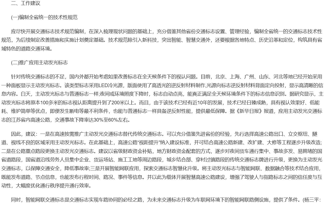 主動發(fā)光標(biāo)志,因其具備獨特的功能優(yōu)勢,主要有:(1)能主動發(fā)光,不需依賴汽車遠(yuǎn)光燈照射;(2)提升標(biāo)志的遠(yuǎn)距離視認(rèn)性;(3)增強(qiáng)標(biāo)志的易捕捉性和警示性;(4)增強(qiáng)標(biāo)志在雨、霧、冰、雪、霾、逆光等惡劣交通環(huán)境中,仍能保持良好的顯示效果。上述功能能彌補(bǔ)在特殊交通環(huán)境中普通逆反射標(biāo)志的功能不足現(xiàn)象。為此,文中還給出相關(guān)建議:“一是在高速按需推廣主動發(fā)光交通標(biāo)志替代傳統(tǒng)交通標(biāo)志。可以充分借鑒先進(jìn)省份的經(jīng)驗,先行選擇高速公路出口、立交樞紐、隧道、視線不良的區(qū)域采用主動發(fā)光標(biāo)志。在此基礎(chǔ)上,高速公路“視距提升”納入建設(shè)標(biāo)準(zhǔn),并可結(jié)合高速公路新建、改擴(kuò)建、大修等工程逐步升級改造;二是在公路重點路段更換主動發(fā)光交通標(biāo)志。建議以省級財政資金補(bǔ)貼,地方財政資金配套的方式,逐步對夜間貨車通行集中、事故多發(fā)、易擁堵的國省道路段,國省道沿線勞務(wù)人員集中企業(yè)、貨運(yùn)場站、施工工地等周邊路段,城鄉(xiāng)結(jié)合部、穿村過鎮(zhèn)路段的傳統(tǒng)交通標(biāo)志牌進(jìn)行升級,更換為主動發(fā)光交通標(biāo)志,以保障交通安全,降低事故率;三是開展智能網(wǎng)聯(lián)應(yīng)用,探索交通標(biāo)志智慧化升級。將主動發(fā)光標(biāo)志與智能網(wǎng)聯(lián)、數(shù)據(jù)融合等技術(shù)結(jié)合應(yīng)用,既能發(fā)布道路、節(jié)點信息,也能發(fā)布行程時間、路況、事件等信息。并以此為載體開展智慧高速公路建設(shè),增強(qiáng)了駕駛?cè)伺c指路標(biāo)志之間的信任度與互動性,大幅度優(yōu)化通行秩序提升通行效率。”