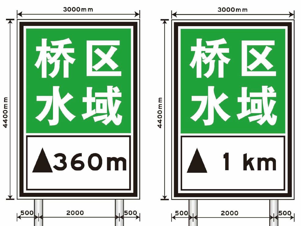 “橋區(qū)水域”航道指示標(biāo)志,設(shè)置于河道兩岸合適位置,主要用于告知通行船舶注意前方橋區(qū)水域的劃定范圍,方便船舶駕駛員能準(zhǔn)確、及時(shí)獲取航道水域相關(guān)信息。其版面分上下兩部分:上部,藍(lán)底白字(橋區(qū)水域);下部,白底黑字(三角+距離數(shù)字);整體黑色邊框。版面尺寸通常為:3000mm *4400mm。通常采用雙立柱安裝方式。如下圖所示: