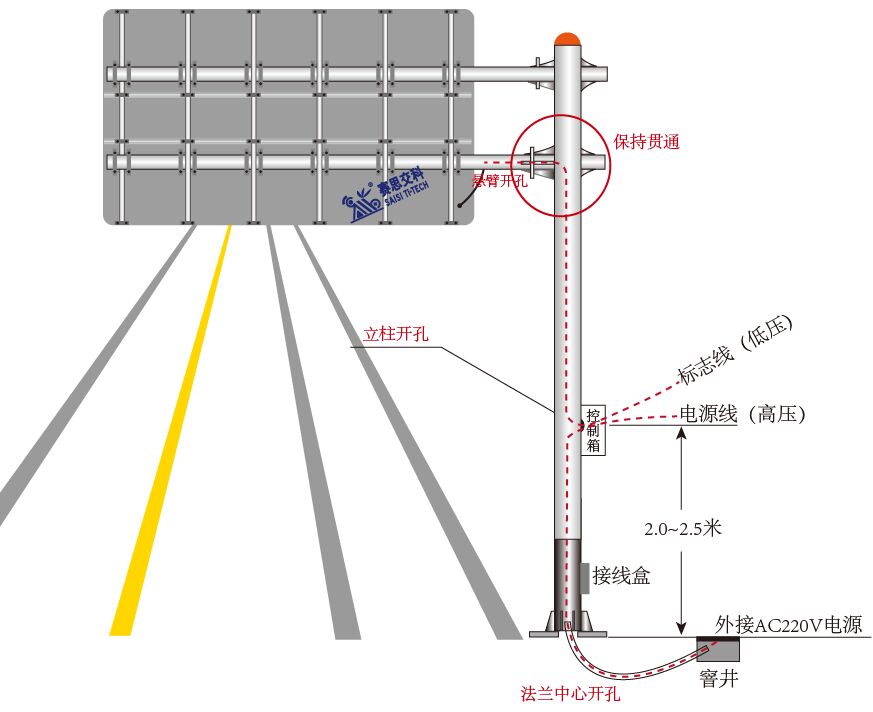 (3)安裝凈空安全。主動(dòng)發(fā)光標(biāo)志的安裝凈空應(yīng)滿(mǎn)足《道路交通標(biāo)志和標(biāo)線》之道路交通標(biāo)志(GB5768.2-2022)的技術(shù)要求,通常,懸臂類(lèi)大型標(biāo)志,其凈空不得小于5.0米,以防車(chē)輛刮蹭;路側(cè)小型標(biāo)志,其凈空不得小于2.2米,以防行人碰頭。因特殊原因,需入侵建筑界限內(nèi)的標(biāo)志設(shè)施,應(yīng)當(dāng)配置必要的反光、發(fā)光警示設(shè)施,加強(qiáng)遠(yuǎn)距離警示。