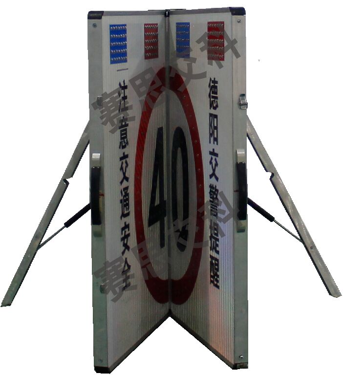2、標(biāo)志版面設(shè)置LED發(fā)光限速標(biāo)志圖案,上置2組(紅爆閃燈+藍(lán)爆閃燈),兩邊設(shè)置交通警示標(biāo)語(yǔ)或管制單位。標(biāo)志整體展開(kāi)后,配置支撐架,放置于管理路段,標(biāo)志閉合時(shí),配有手提把,警員可輕松提攜,方便、便攜。